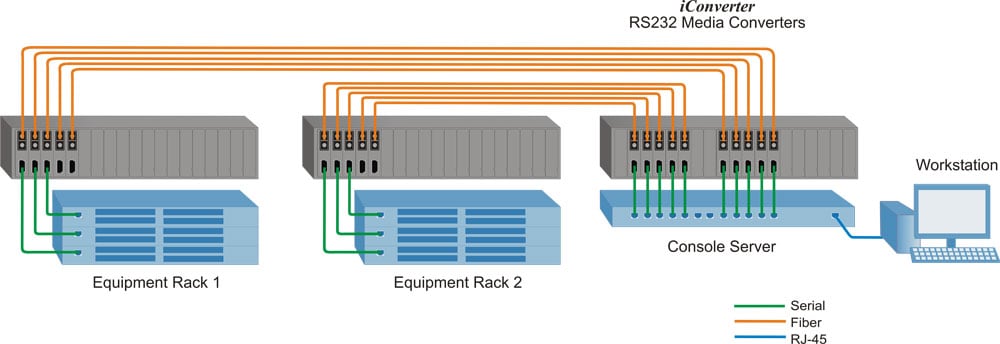 The following example illustrates how data centers can centralize management through a console server using iConverter RS-232 media converters installed in a 19-module chassis.